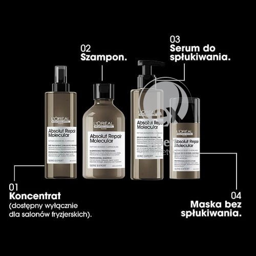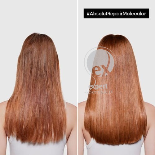 Spryskać wilgotne włosy od długości po końce. Nałożyć od 15 do 20 pompek w zależności od długości włosów. Nakładać na każdą sekcję gestem gładzenia. Rozprowadzać na całej długości i końcach włosów od 1 do 2 minut. Nie spłukiwać. Stosując technikę warstwową, nałożyć szampon Absolut Repair Molecular na włosy, następnie spłukać i nałożyć serum bez spłukiwania. W przypadku kontaktu z oczami natychmiast dokładnie je przepłukać.